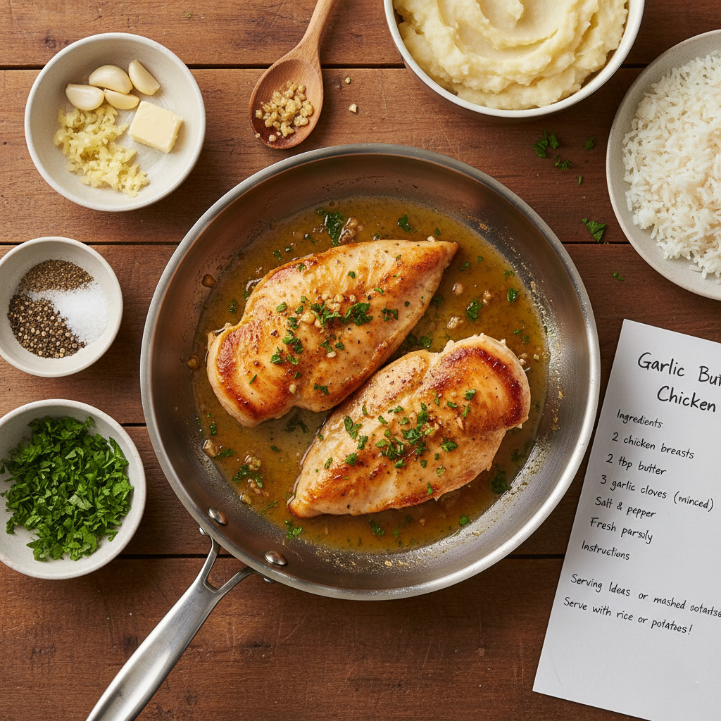 Ingredients 2 chicken breasts 3 tbsp butter 3 garlic cloves (minced) Salt & pepper Fresh parsley Instructions Season chicken with ...